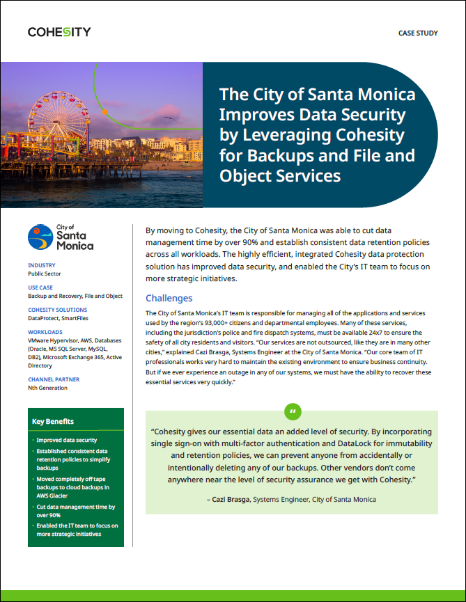 By moving to Cohesity, the City of Santa Monica was able to cut data management time by over 90% and establish consistent data retention policies across all workloads. View the case study to learn how by utilizing a Cohesity data protection solution the City’s IT team has improved data security, and been able to focus on more strategic initiatives.