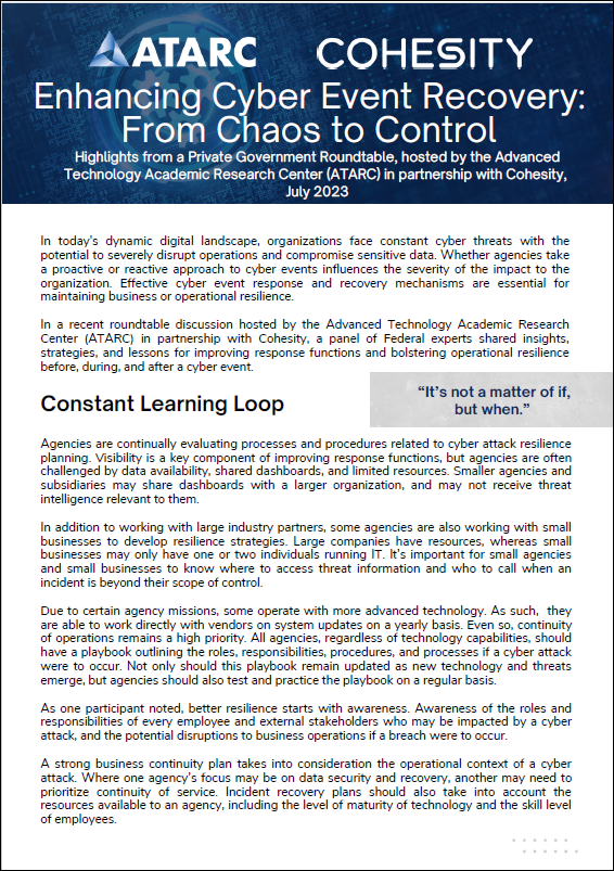 In today’s dynamic digital landscape, organizations face constant cyber threats with the potential to severely disrupt operations and compromise sensitive data. Whether agencies take a proactive or reactive approach to cyber events influences the severity of the impact to the organization. Effective cyber event response and recovery mechanisms are essential for maintaining business or operational resilience.