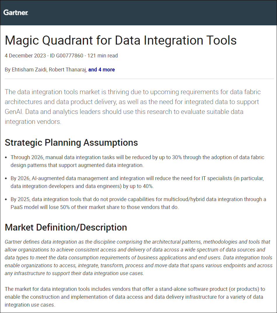Gartner Magic Quadrant for Data Integration Tools, Ehtisham Zaidi, Robert Thanaraj, Sharat Menon, Thornton Craig, Roxane Edjlali, Michele Launi December 4, 2023