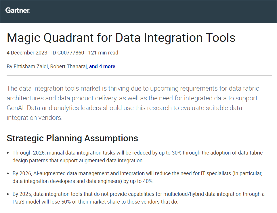 Finden Sie mit dem Gartner® Magic Quadrant™ 2023 für Data Integration Tools den Anbieter von Datenintegrationslösungen, der Ihre einzigartigen Geschäftsanforderungen erfüllt. Informatica ist als „Leader“ ausgezeichnet worden.