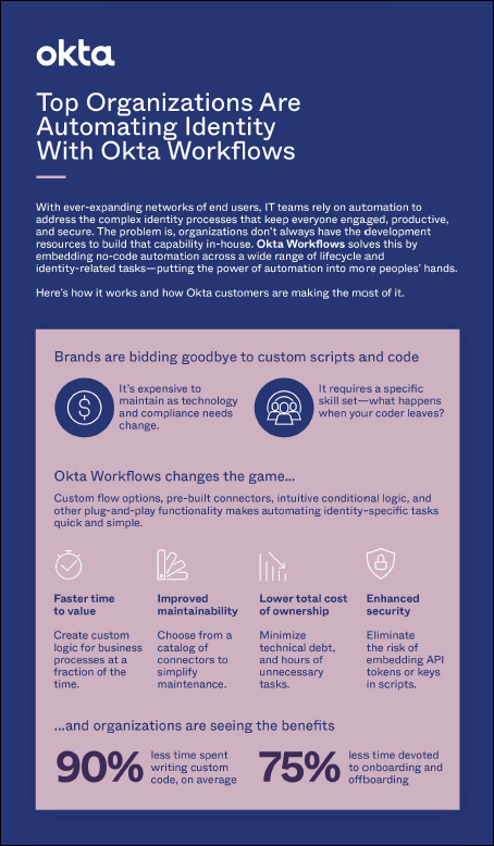 Check out the infographic below to learn how three Okta customers have used Okta Workflows to automate their lifecycles processes.