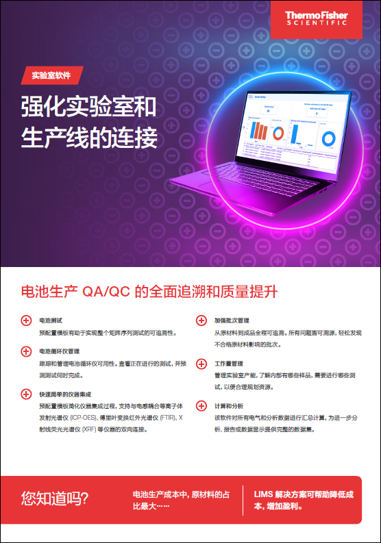 Thermo Scientific™ SampleManager™ LIMS 软件的电池解决方案通过连接各个工作流程、提高一致性和持续改进产品质量来为电池制造商提供更快速的实施方案。