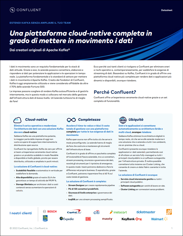 Scarica la scheda tecnica e scopri di più sui vantaggi di Confluent. Risparmia fino al 60% di TCO rispetto all’open source e sblocca in tempo reale