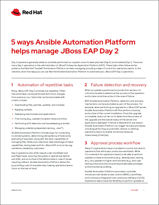 Read this checklist to learn 5 ways you can use Ansible Automation Platform to automate your JBoss EAP Day 2 operations.