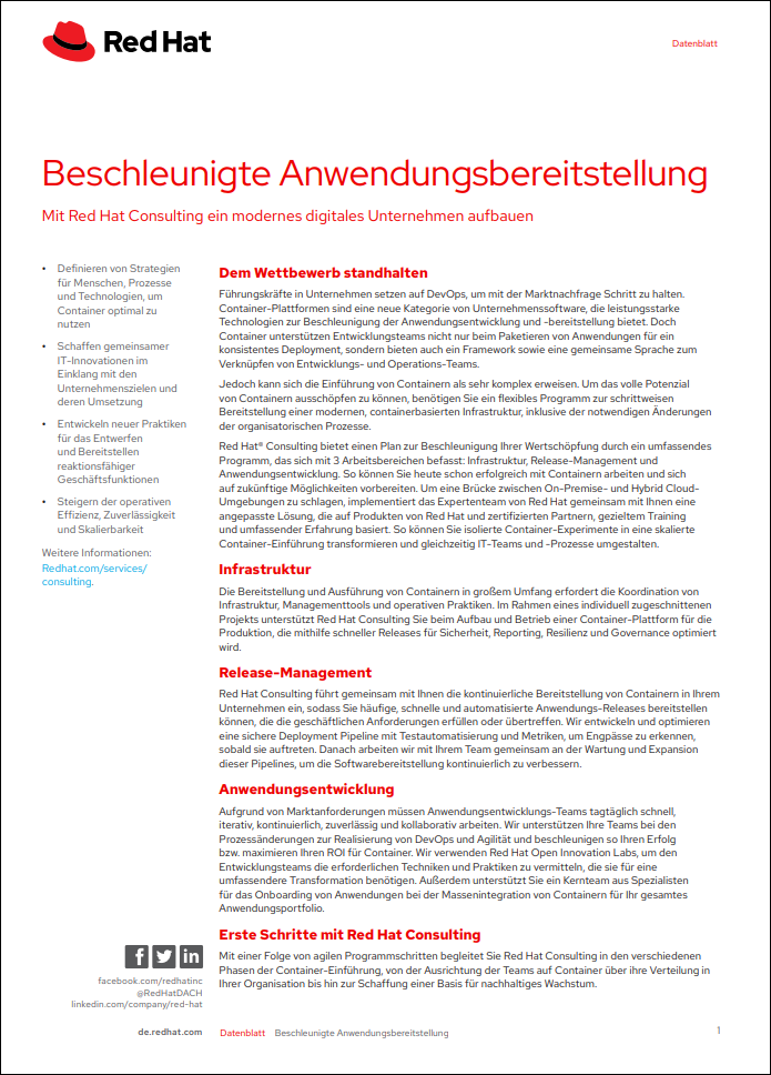 Laden Sie dieses Dokument herunter und erfahren Sie, wie Red Hat Consulting einen Plan zur Verkürzung der Wertschöpfung bietet.