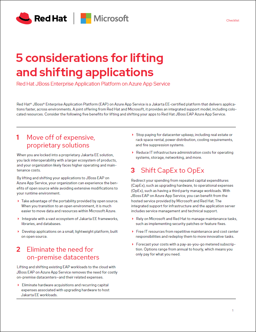 This checklist details five benefits for lifting and shifting your apps to Red Hat JBoss EAP Azure App Service.