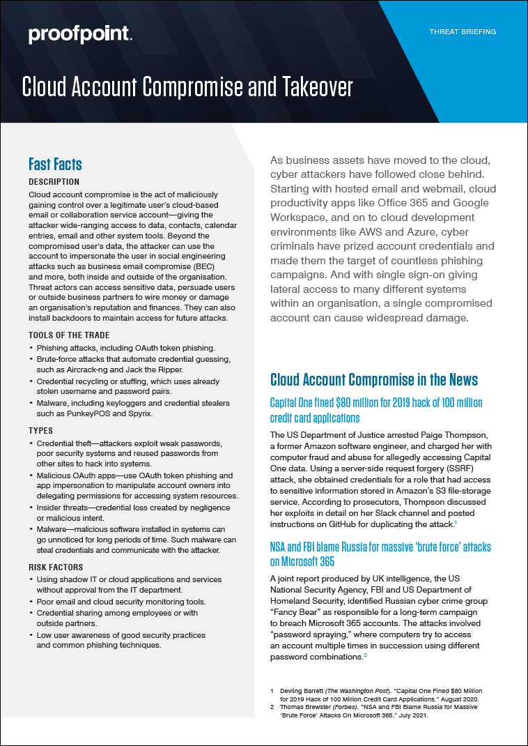 Cyber criminals are getting bolder and more sophisticated with their threats. As more business assets move to the cloud, attackers have followed close behind. This cloud account compromise threat brief will help you understand: