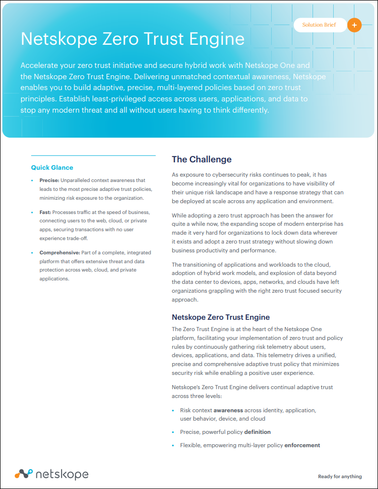 Accelerate your zero trust initiative and secure hybrid work with Netskope One and the Netskope Zero Trust Engine. Delivering unmatched contextual awareness, Netskope enables you to build adaptive, precise, multi-layered policies based on zero trust principles. Establish least-privileged access across users, applications, and data to stop any modern threat and all without users having to think differently.