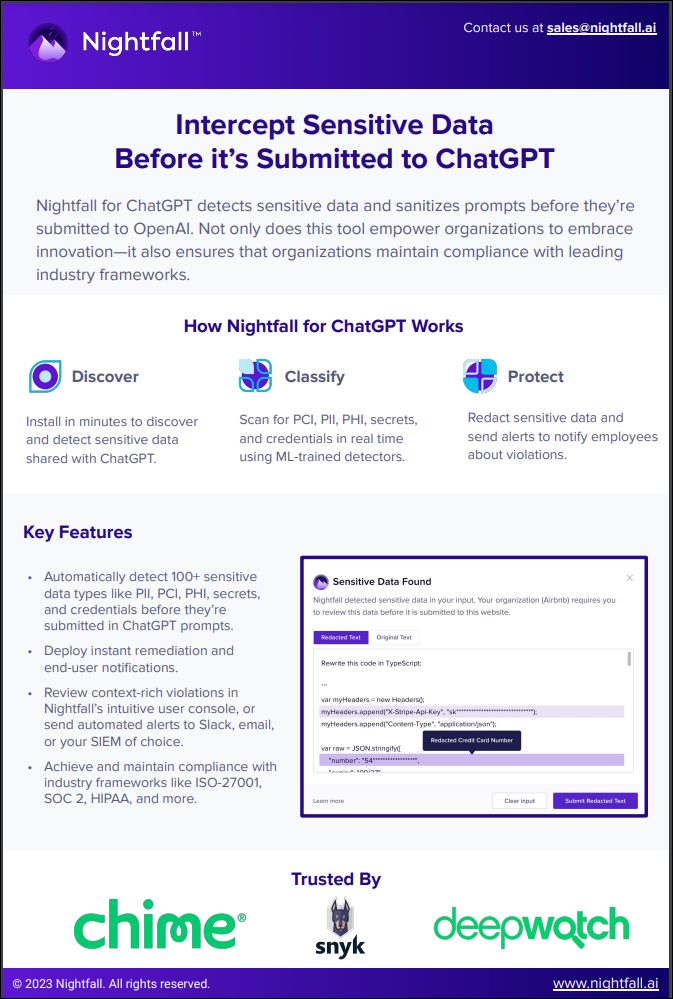 By integrating Nightfall, businesses can confidently embrace innovation while safeguarding their sensitive information against potential breaches and compliance violations. As a security leader, how can you implement such solutions to enhance your organization’s data protection strategy and maintain a competitive edge in the digital era?