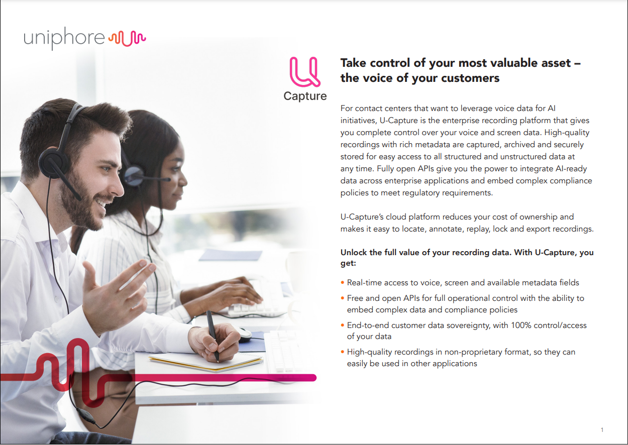 For contact centers that want to leverage voice data for AI initiatives, U-Capture is the enterprise recording platform that gives you complete control over your voice and screen data. High-quality recordings with rich metadata are captured, archived and securely stored for easy access to all structured and unstructured data at any time. Fully open APIs give you the power to integrate AI-ready data across enterprise applications and embed complex compliance policies to meet regulatory requirements.