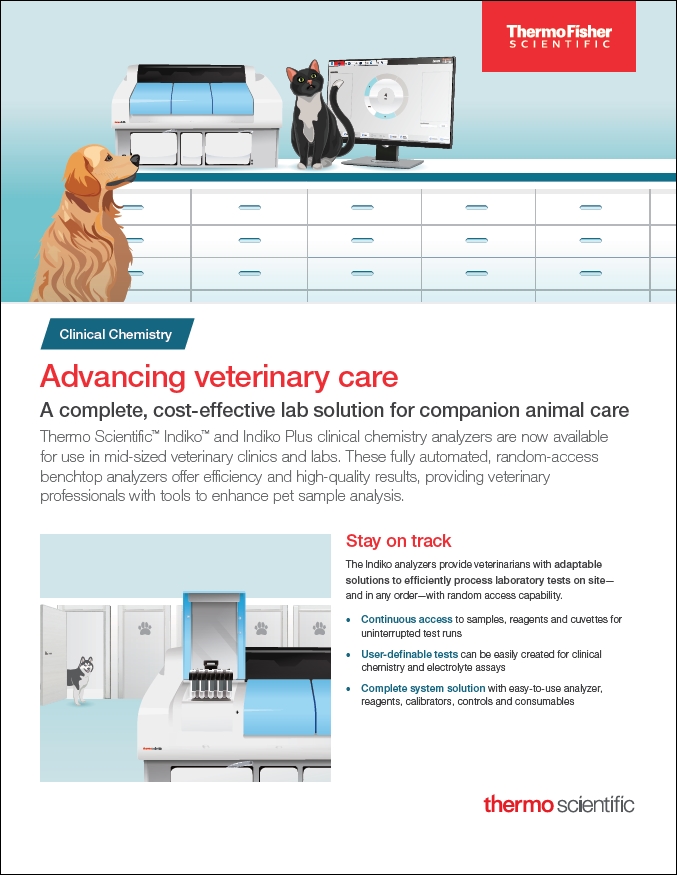 Thermo Scientific™ Indiko™ and Indiko Plus clinical chemistry analyzers are now available for use in veterinary clinics and labs. Our animal companions deserve the high-quality care and testing that facilitates well-informed care decisions. The Indiko analyzers provide veterinarians with adaptable solutions to efficiently process laboratory tests on site—and in any order—with random access capability. Download now to learn how the Thermo Scientific™ Indiko™ and Indiko Plus Clinical Chemistry Analyzers: