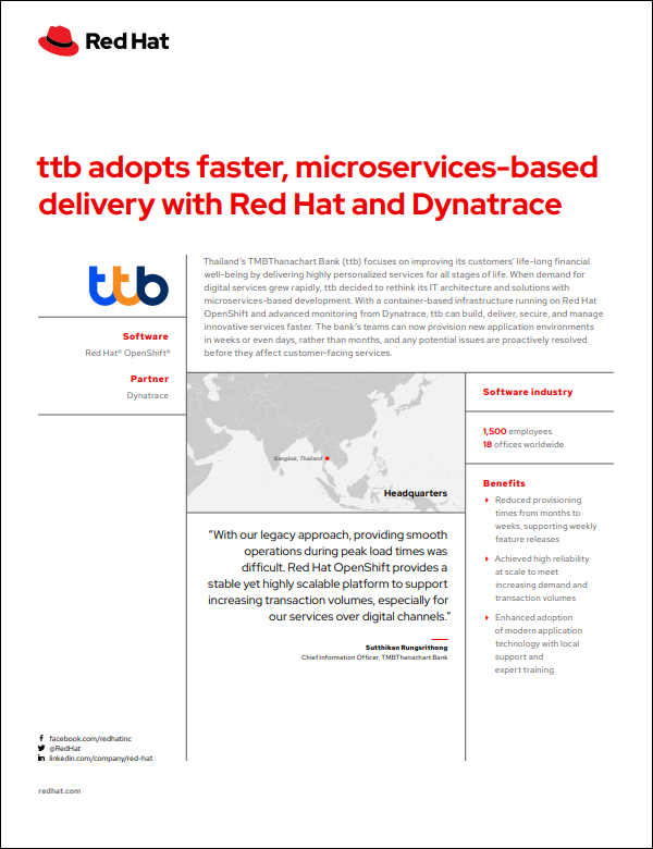 Thailand’s TMBThanachart Bank (ttb) focuses on improving its customers’ life-long financial well-being by delivering highly personalized services for all stages of life. When demand for digital services grew rapidly, ttb decided to rethink its IT architecture and solutions with microservices-based development. With a container-based infrastructure running on Red Hat OpenShift and advanced monitoring from Dynatrace, ttb can build, deliver, secure, and manage innovative services faster. The bank’s teams can now provision new application environments in weeks or even days, rather than months, and any potential issues are proactively resolved before they affect customer-facing services.