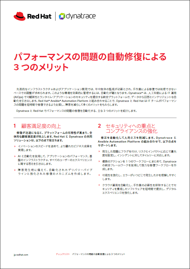 Dynatrace と Red Hat でパフォーマンスの問題の修復を自動化する、主な 3 つのメリットを紹介します。