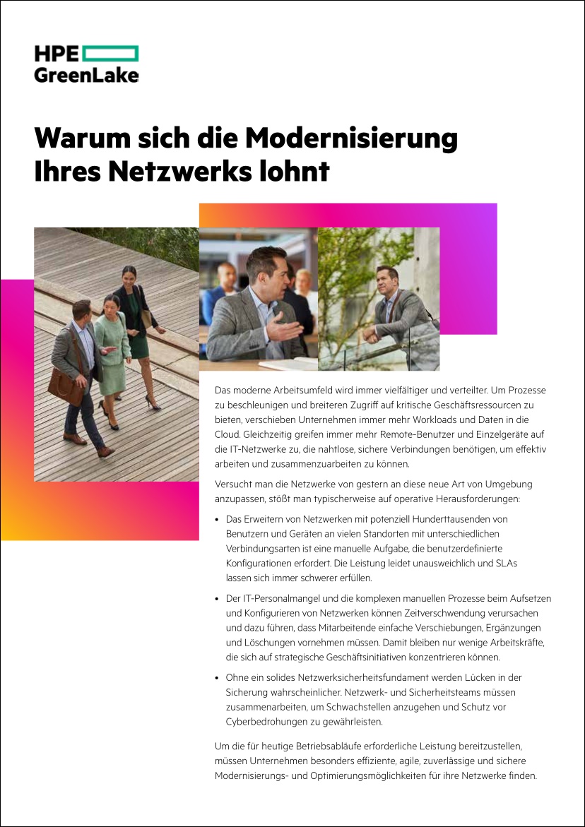 Bei der Netzwerkmodernisierung geht es nicht einfach nur darum, die aktuelle Infrastruktur zu aktualisieren, damit sie mit der nächsten Technologie-Generation Schritt halten kann. Der Aufbau einer agilen Netzwerkbasis, die die Fähigkeit Ihres Unternehmens verbessert, Initiativen zur digitalen Transformation schnell umzusetzen, indem Sie von den Vorteilen neuer Konzepte für Architektur, Sicherheit, Management und Bereitstellung profitieren. Ein modernes Netzwerk ist kein zukünftiger Zustand, der nur schwer erreichbar ist. Erfahren Sie mehr über die Schritte und Vorteile zum Erzielen einer universellen Netzwerk-Transparenz und -Kontrolle.