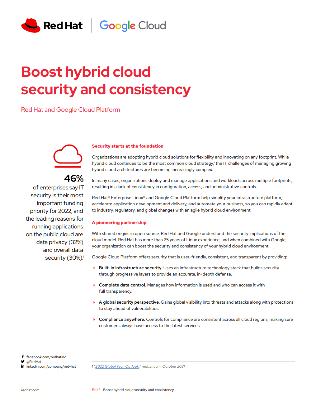 Discover Red Hat Enterprise Linux on Google Cloud Platform to boost security and consistency for your hybrid cloud environment.