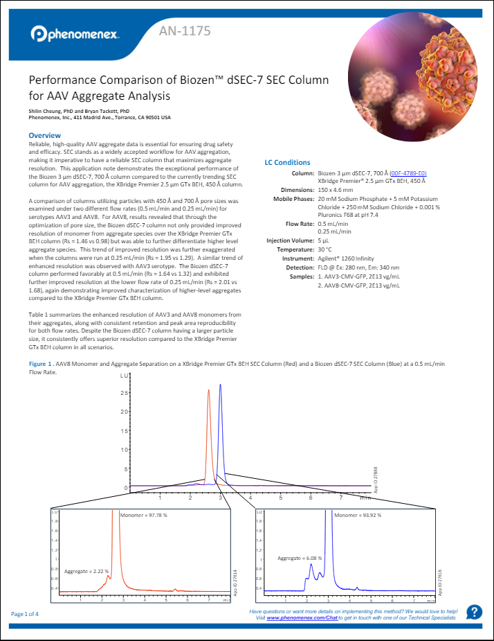 In this application note, Biozen 3 µm dSEC-7, 700 Å column exhibits superior performance when compared to XBridge Premier 2.5 µm GTx BEH, 450 Å column in resolving monomer from aggregates, showcasing its enhanced ability to characterize higher-level aggregates for AAV3 and AAV8 serotypes. Exceptional resolution (up to Rs=2.01) is achieved even at lower flow rates (0.25 mL/min) while maintaining consistent retention and peak area reproducibility.