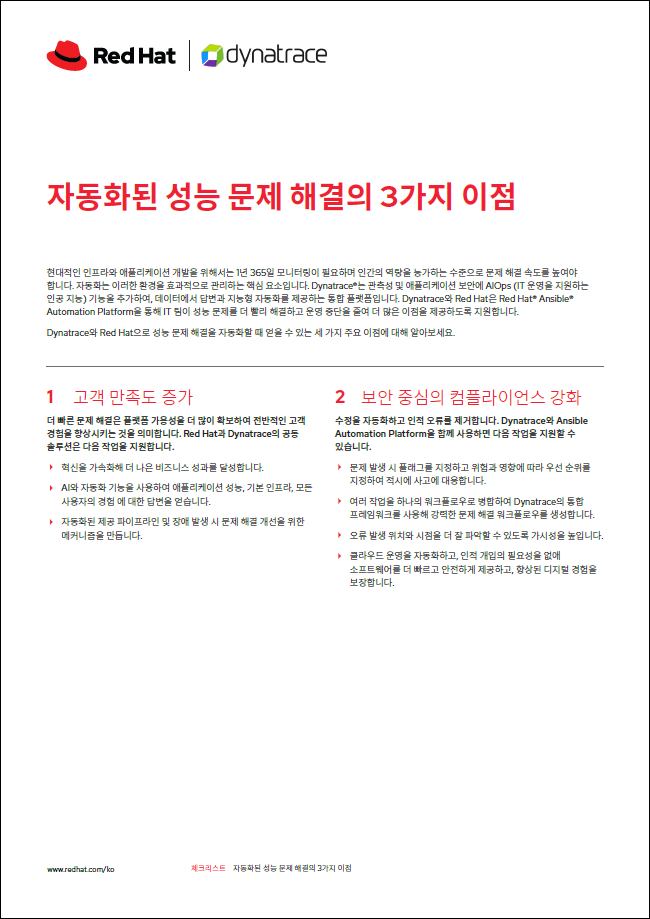 Dynatrace와 Red Hat으로 성능 문제 해결을 자동화할 때 얻을 수 있는 세 가지 주요 이점에 대해 알아보세요.