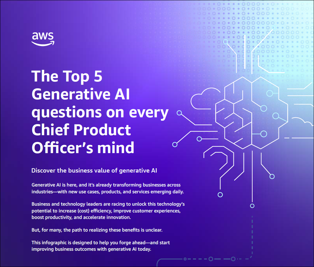 Generative AI can help software companies reinvent the way they develop new products and services—maximizing the value they can offer to their customers and minimizing the time it takes to deliver excellent results. Amazon Web Services (AWS) can help you harness the potential of generative AI to create long- lasting, high-value customer relationships. Take a look at our latest infographic— Top 5 Generative AI Questions on Every Product Team’s Mind—featuring the top five questions (and answers) about generative AI to take your product to the next level.