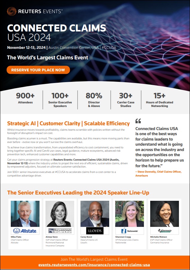 That’s why 900+ insurance leaders attend Reuters Events: Connected Claims USA 2024 (Austin, Nov 12-13); where the industry unites to propel the next era of efficient claims, driven by empowered adjusters, focused on ultimate customer satisfaction.