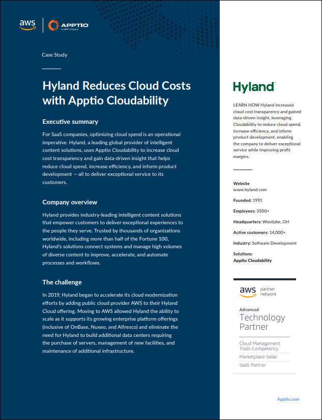 For SaaS companies, optimizing cloud spend is an operational imperative. Hyland, a leading global provider of intelligent content solutions, uses Apptio Cloudability to increase cloud cost transparency and gain data-driven insight that helps reduce cloud spend, increase efficiency, and inform product development — all to deliver exceptional service to its customers.