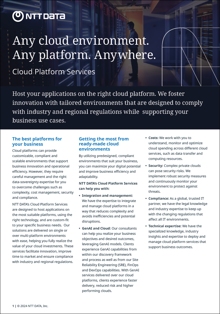 Unlock the secrets to enhancing business adaptability and efficiency through NTT DATA’s comprehensive Cloud Platform Services. Our guide navigates you through the seamless integration and management of cloud platforms, using GenAI to fine-tune your business processes for unprecedented outcomes.