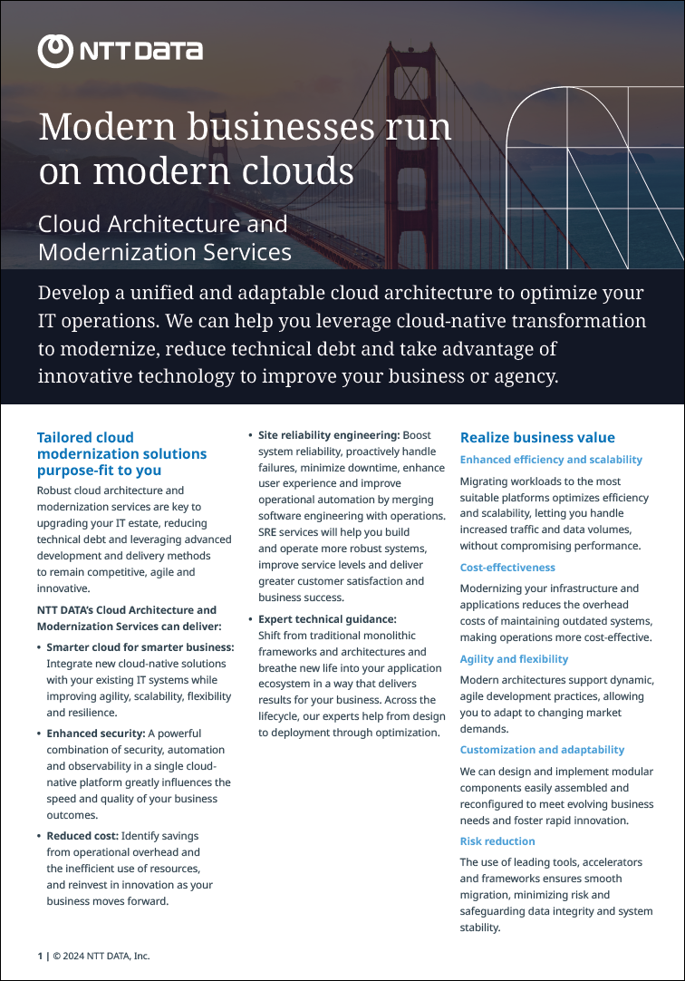 Unlock the potential of cloud architecture and modernization to drive your business forward. With NTT DATA, experience a transformation that aligns with future success.