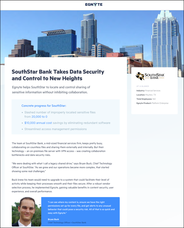 The team at SouthStar Bank, a mid-sized financial services firm, keeps pretty busy, collaborating on countless files and sharing them externally and internally. But their technology an on-premises file server with VPN access was creating collaboration bottlenecks and data security risks.
