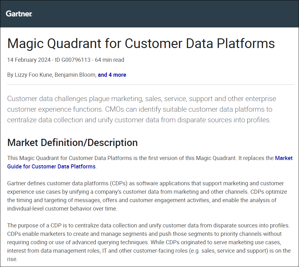 Gartner Magic Quadrant for Customer Data Platforms, Lizzy Foo Kune, Rachel Smith, Suzanne White, Benjamin Bloom, Adriel Tey, David Walters, 14 February 2024.
