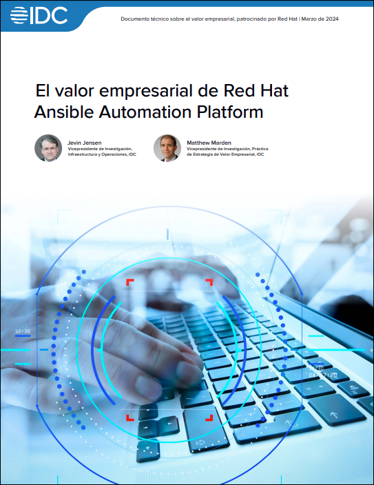 El estudio de IDC sobre el valor de Red Hat Ansible Automation Platform descubrió que los usuarios obtuvieron beneficios del 668% de ROI a 3 años, un 61% de reducción en el tiempo de inactividad imprevisto, y mucho más. Descargue para saber más.