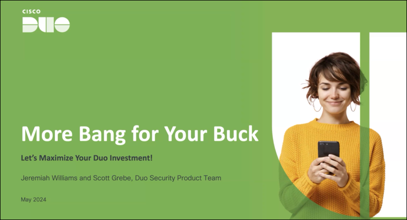 If you’ve ever purchased a product or service for your organization, you know it’s important to get the most value for your money. But to get that value, organizations need to use the features the product or service provides. All of them. Sometimes, that can be challenging. When it comes to your Duo subscription, we’re here to help. We can show you how to take advantage of all the key features in your Duo edition, so you get more bang for your buck. In this one-hour webinar we’ll discuss the features available to you in the Duo Advantage edition and demonstrate how to configure those features so you can do it yourself with confidence and maximize the value of your Duo investment.