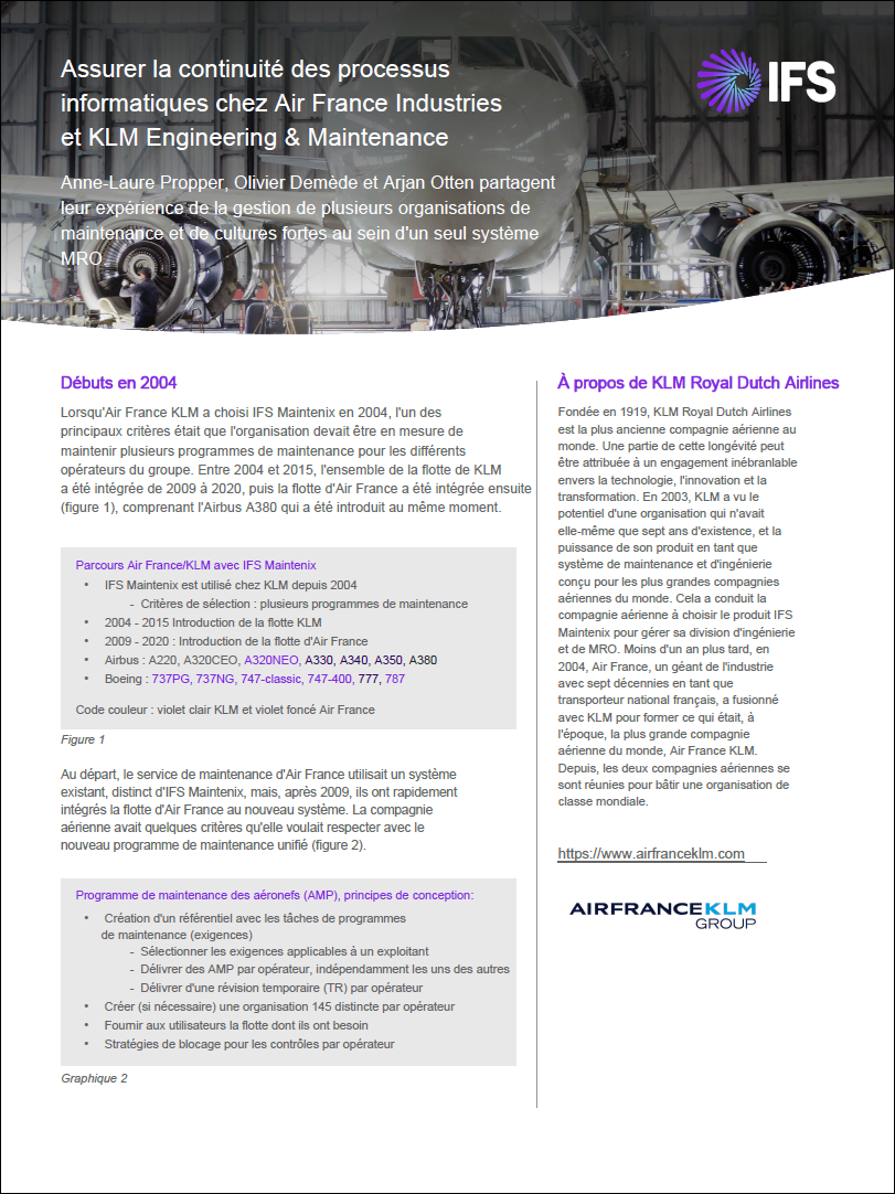 Lorsqu’Air France KLM a choisi IFS Maintenix en 2004, l’un des principaux critères était que l’organisation devait être en mesure de maintenir plusieurs programmes de maintenance pour les différents opérateurs du groupe. Entre 2004 et 2015, l’ensemble de la flotte de KLM a été intégrée de 2009 à 2020, puis la flotte d’Air France a été intégrée ensuite, comprenant l’Airbus A380 qui a été introduit au même moment.