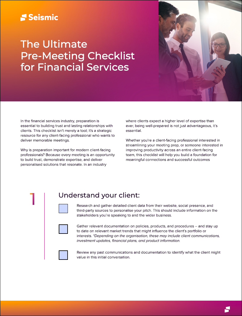 In the financial services industry, preparation is essential to building trust and lasting relationships with clients. Whether you’re a client-facing professional interested in streamlining your meeting prep, or someone interested in improving productivity across an entire client-facing team, this checklist will help you build a foundation for meaningful connections and successful outcomes.
