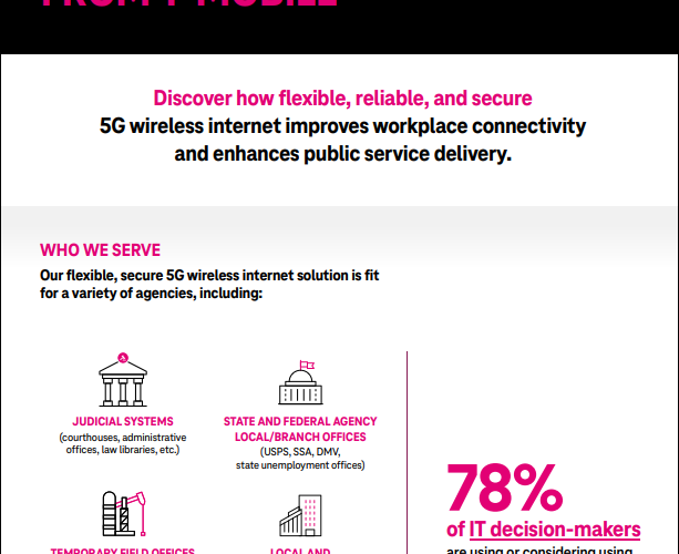 In an era where digital efficiency underpins governmental success, T-Mobile’s 5G Internet for Government emerges as a game-changer. This whitepaper unveils a robust fixed wireless solution engineered to meet the distinct connectivity demands of federal and local entities, including schools and law enforcement. With a focus on comprehensive coverage, swift deployment, and advanced security features, this solution is designed to fuel digital transformation across government sectors effortlessly.