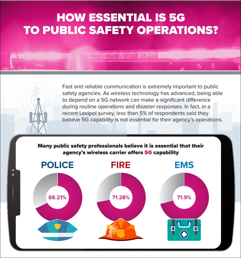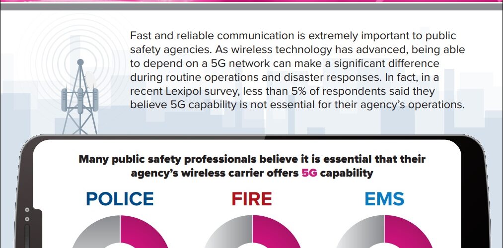 Fast and reliable communication is extremely important to public safety agencies. As wireless technology has advanced, being able to depend on a 5G network can make a significant difference during routine operations and disaster responses. In fact, in a recent Lexipol survey, less than 5% of respondents said they believe 5G capability is not essential for their agency’s operations.