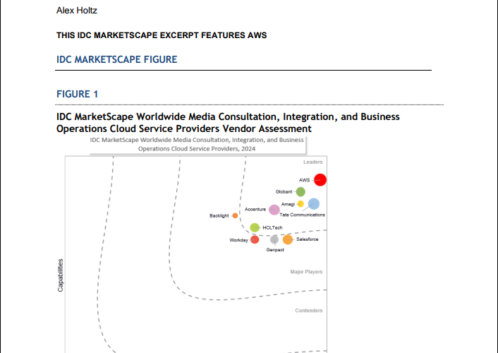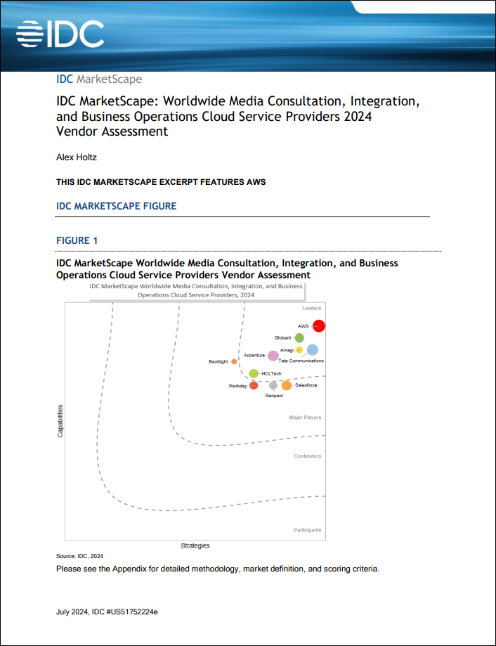 Amazon Web Services (AWS) is recognized as a Leader in the IDC MarketScape: Worldwide Media Consultation, Integration, and Business Operations Cloud Service Providers 2024