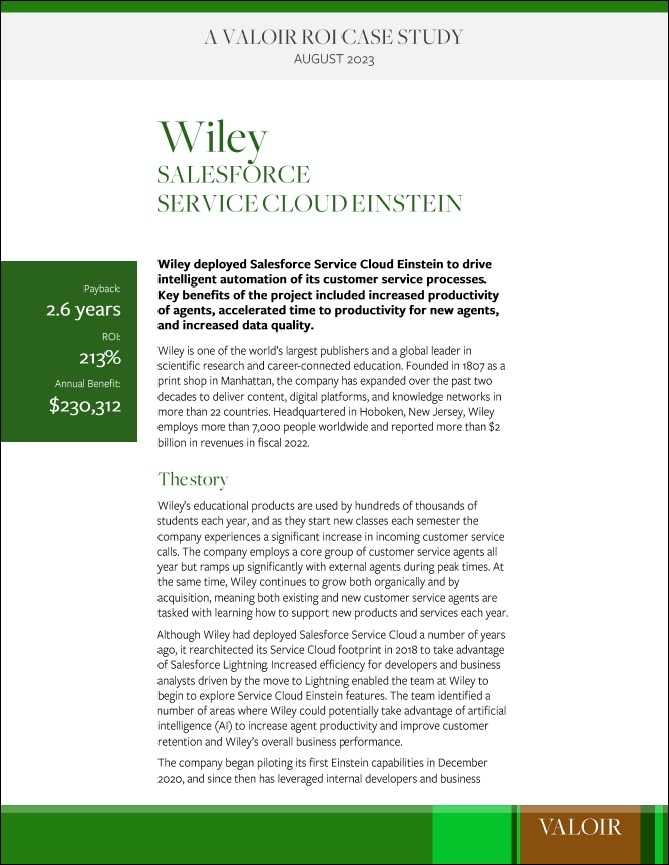 Find out how Wiley saw a 213% ROI increase with Service Cloud Einstein. See how you can power efficient customer service when you: