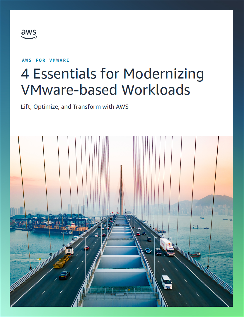 Read the eBook 4 Essentials for Modernizing VMware-Based Workloads—Lift, Optimize, and Transform with AWS to learn critical considerations for driving successful cloud migration and to see how AWS is helping organizations with VMware-based workloads achieve strategic cloud adoption for long-term success.