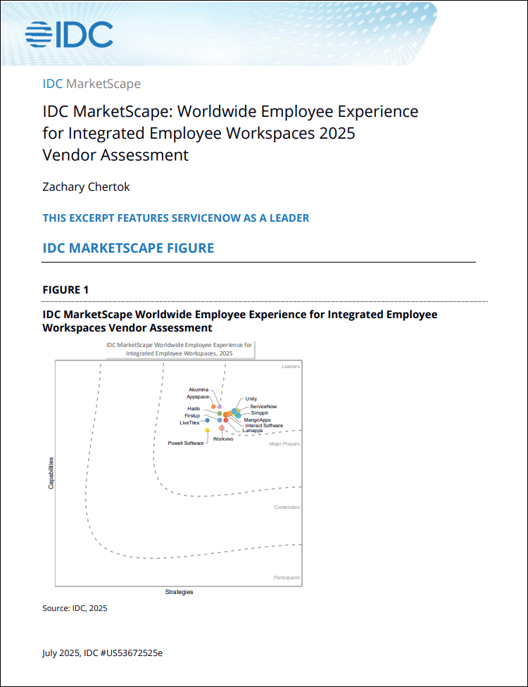 ServiceNow has been recognized as a leader in the 2025 IDC MarketScape: Worldwide Employee Experience for Integrated Employee Workspaces. Read the report excerpt to discover why, and gain insights on building smarter, more personalized employee experiences that deliver measurable business results.
