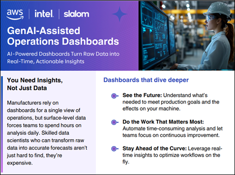 Slalom’s GenAI-Assisted Operations Dashboard Accelerator provides more than just metrics: from better resource allocation to cause and effect analysis, it’s the brain of your factory floor. Reduce manual data prep and let AI ask the right questions for actionable outcomes.