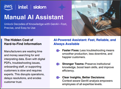 Slalom’s Manual AI Assistant Accelerator automates manual analysis, providing real-time AI-driven insights. Manufacturers can streamline workflows, empower nontechnical teams with instant answers, and make faster, informed decisions—reducing costs and eliminating bottlenecks.