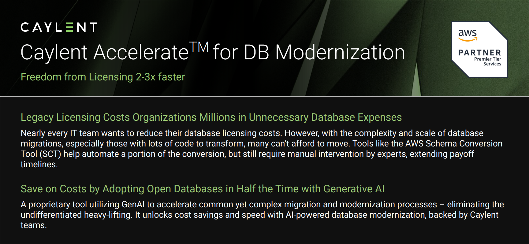 Legacy database licensing is draining IT budgets — and traditional migration methods are slow, complex, and resource-intensive. That’s why Caylent Accelerate™ combines the power of Generative AI with proven cloud architecture to help organizations modernize faster, smarter, and at lower cost.