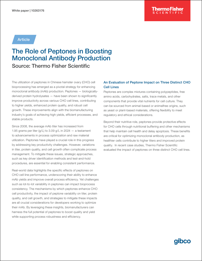 Discover how strategic use of animal-origin-free (AOF) peptones can dramatically boost monoclonal antibody (mAb) titers, enhance CHO cell viability, and improve protein quality — all while maintaining process consistency. This white paper reveals how peptone selection and optimization can drive up to 64% higher yields and support robust, scalable biomanufacturing.