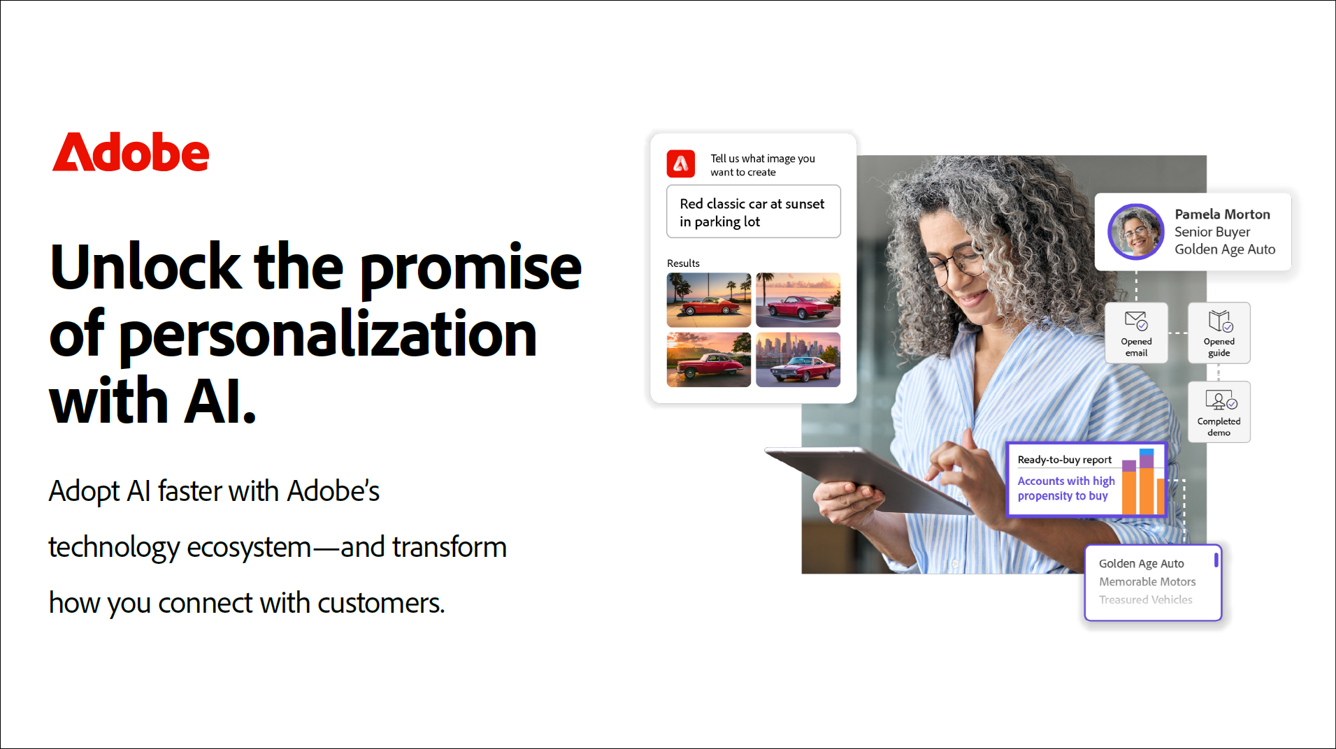 Equipping your marketing tech stack with AI makes it faster and easier to give your customers the experiences they expect. Learn how Adobe and our partners can help you gain a competitive advantage through:
