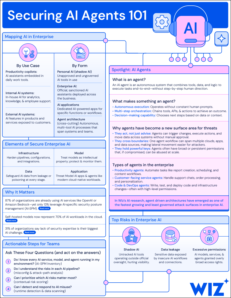AI agents are becoming a major enterprise attack surface because they work autonomously, span multiple systems, and often hold high-level permissions. With widespread AI adoption—and the rise of untracked shadow AI—the risks of data leakage, excessive access, and insecure pipelines are increasing. Securing agents means knowing every AI tool in use, prioritizing key risks, and detecting misuse in real time.